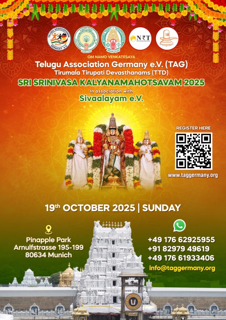 With deep joy and devotion, Telugu Association Germany e.V. and Sivaalayam e.V. invite you and your family to Sri Srinivasa Kalyanam, the sacred celestial wedding of Lord Venkateswara of Tirumala Tirupati. Please come and share this holy experience with us and feel the grace of the Lord. This Kalyanam is conducted with the divine guidance and blessings of Tirumala Tirupati Devasthanams (TTD). It is part of the official EU tour of Kalyanams and will take place in Munich. The atmosphere will be pure, peaceful, and full of devotion.